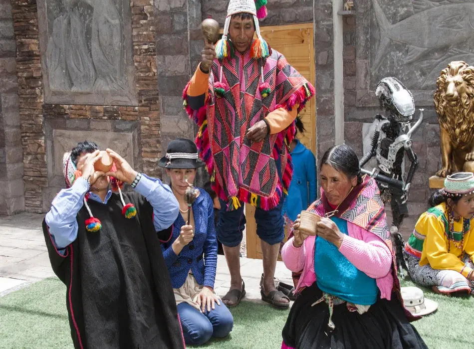 • The Master Shaman is from the Queros tribe, asks permission by means of a prayer to the sky and the earth, to connect to the coca leaves and be able to give an answer to the interested party. He then rings his bell in the direction of the four points of the Tawantinsuyo (the four divisions of the Inca empire), making a sign with leaves in his hands.